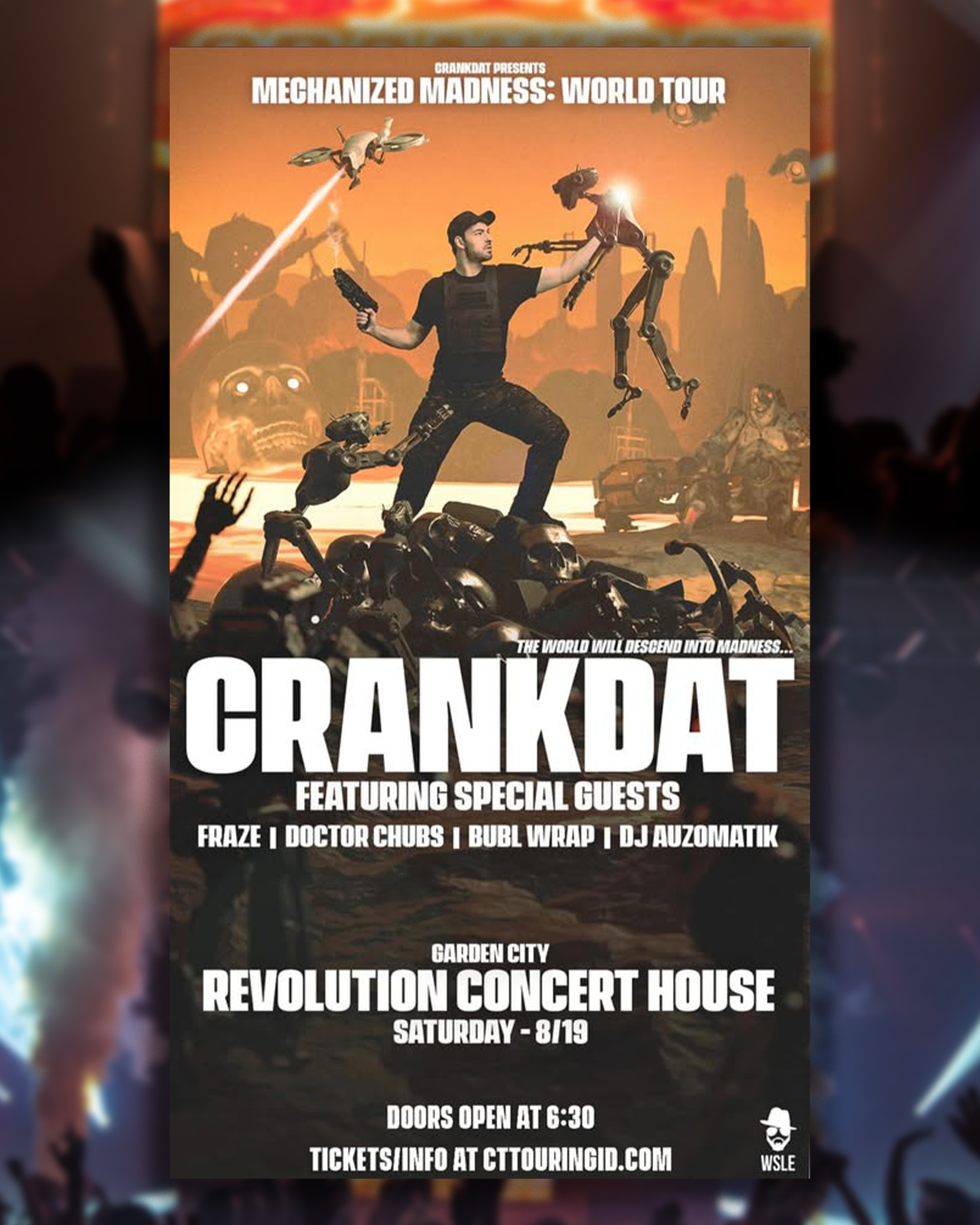 Start the school year with the biggest party in the valley! Crankdat will be at the Revolution Concert House on August 19th for his Mechanized Madness World Tour featuring special guests Fraze, Doctor Chubs, bubl wrap, Auzomatik, HippieFlipped, and Hooked On Tronicz. Get Tickets/Info at cttouringid.com.